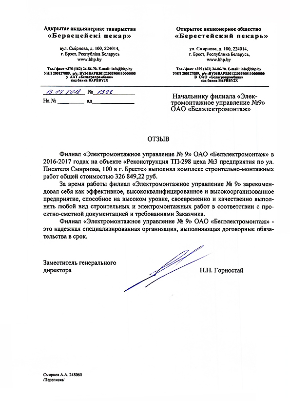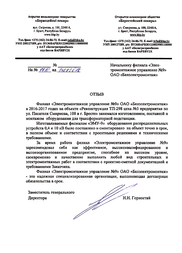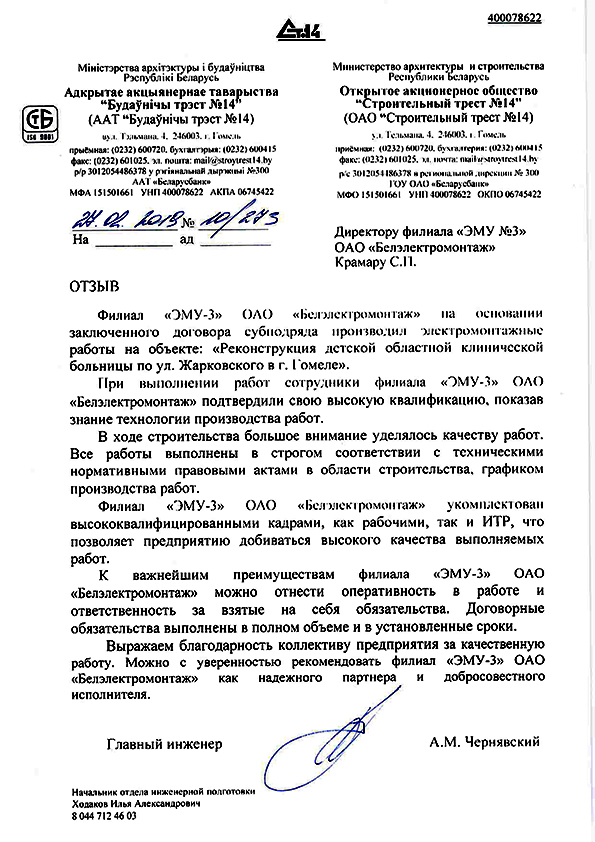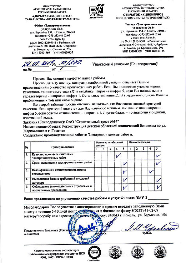 Evaluation of the work of the branch "EID-3" OJSC "BEM" by the general contractor OJSC "Stroytrest No. 14", Gomel 27.02.2019