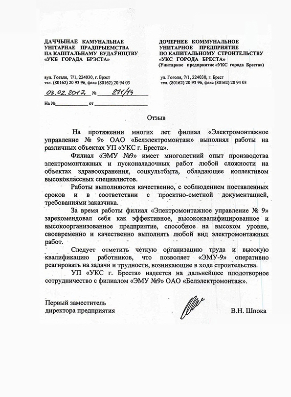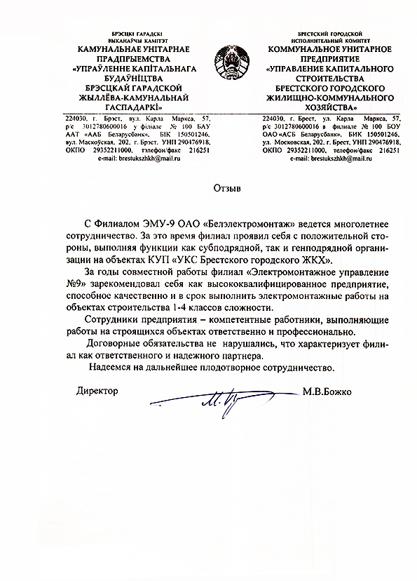 Review of the branch "EID-9" of OJSC "BEM" from the UUE "Capital construction management of the Brest city housing and communal services"