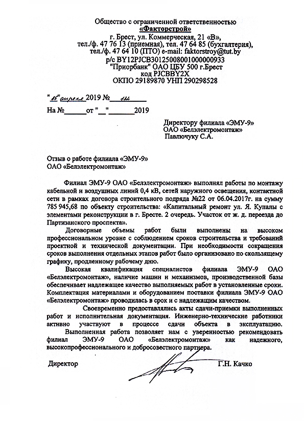 Review of the branch "EID-9" OJSC "BEM" from LLC "Factorstroy", Brest 25/04/2019