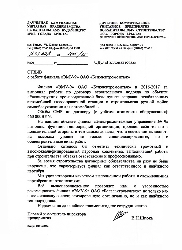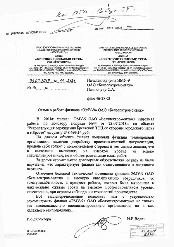 Review of the branch "EID-9" of OJSC "BEM" from the UUE for capital construction "CCD of Brest" 18/07/2018