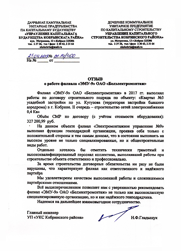 Review of the branch "EID-9" of OJSC "BEM" from the UE for capital construction of the Kobrin region 25/04/2019