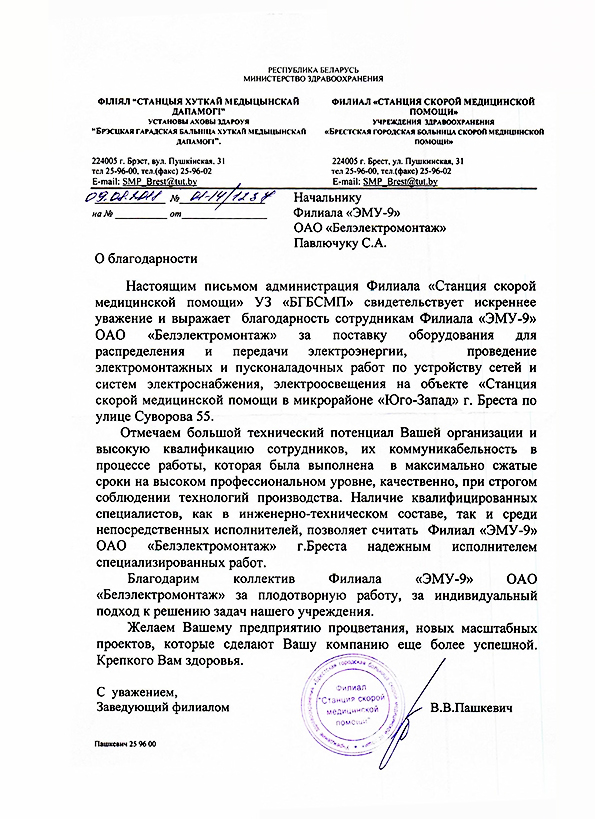 Gratitude to the branch "EMU-9" OJSC "BEM" from the branch "Ambulance station" 09/08/2018