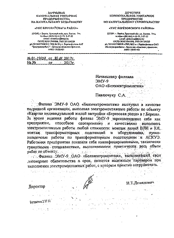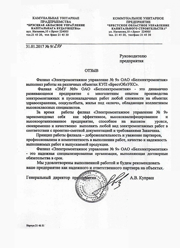 Review of the branch "EID-9" of OJSC "BEM" from the UUE "Brest Regional Administration of Capital Construction" 31/01/2017