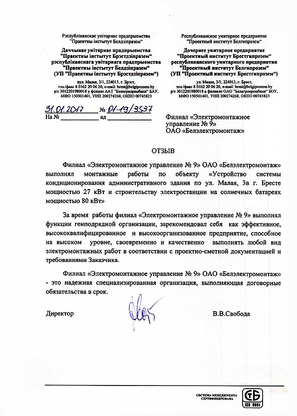 Review of the branch "EID-9" OJSC "BEM" from the Unitary Enterprise "Design Institute Belgiprozem" 31/01/2017