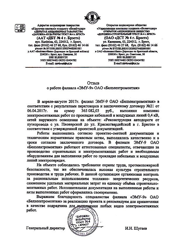 Review of the branch "EID-9" of OJSC "BEM" from OJSC "Managing company of the holding OJSC" Road construction trust No. 4, Brest "